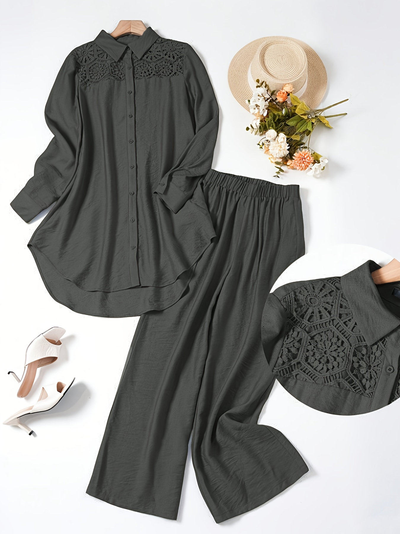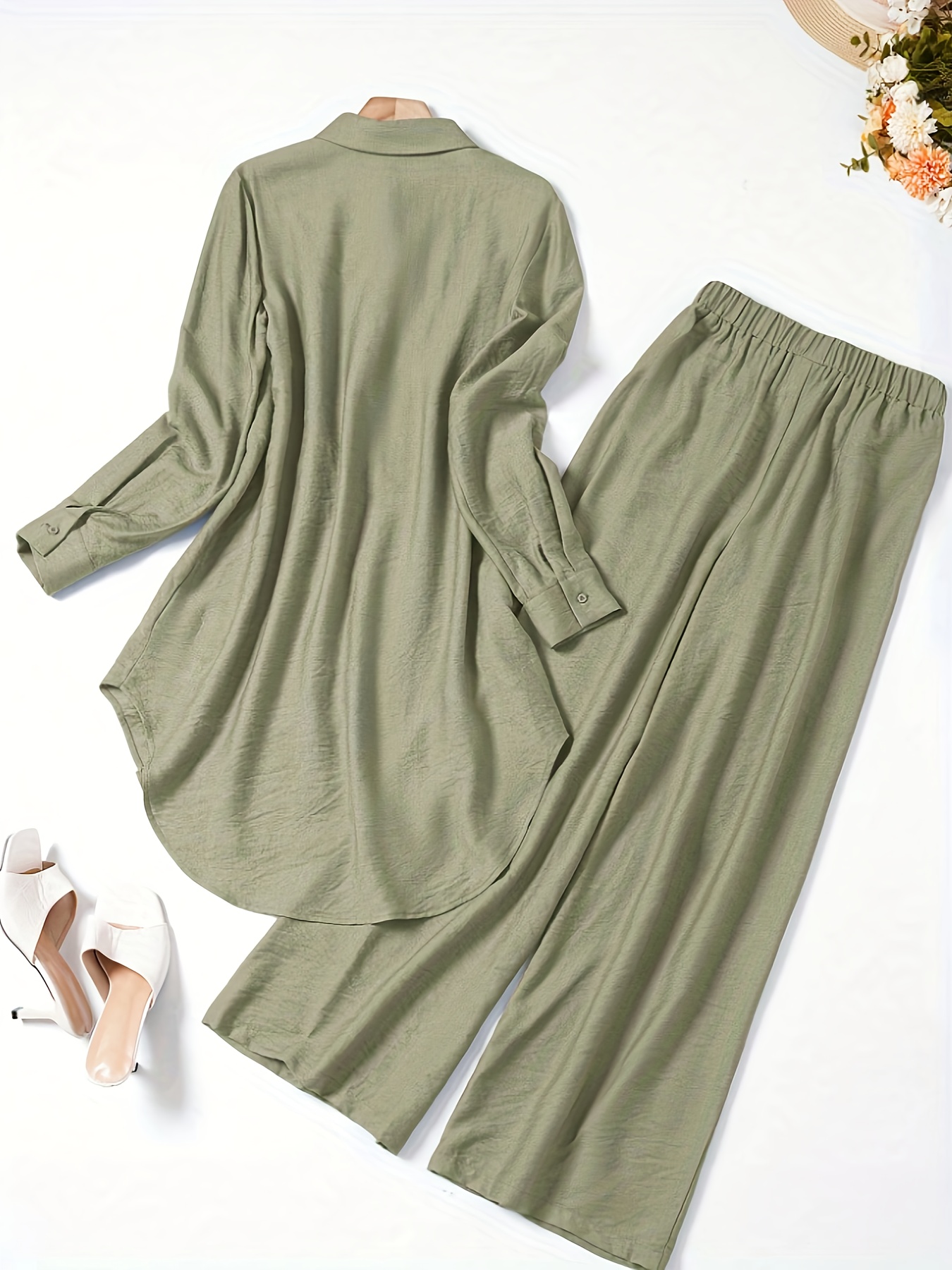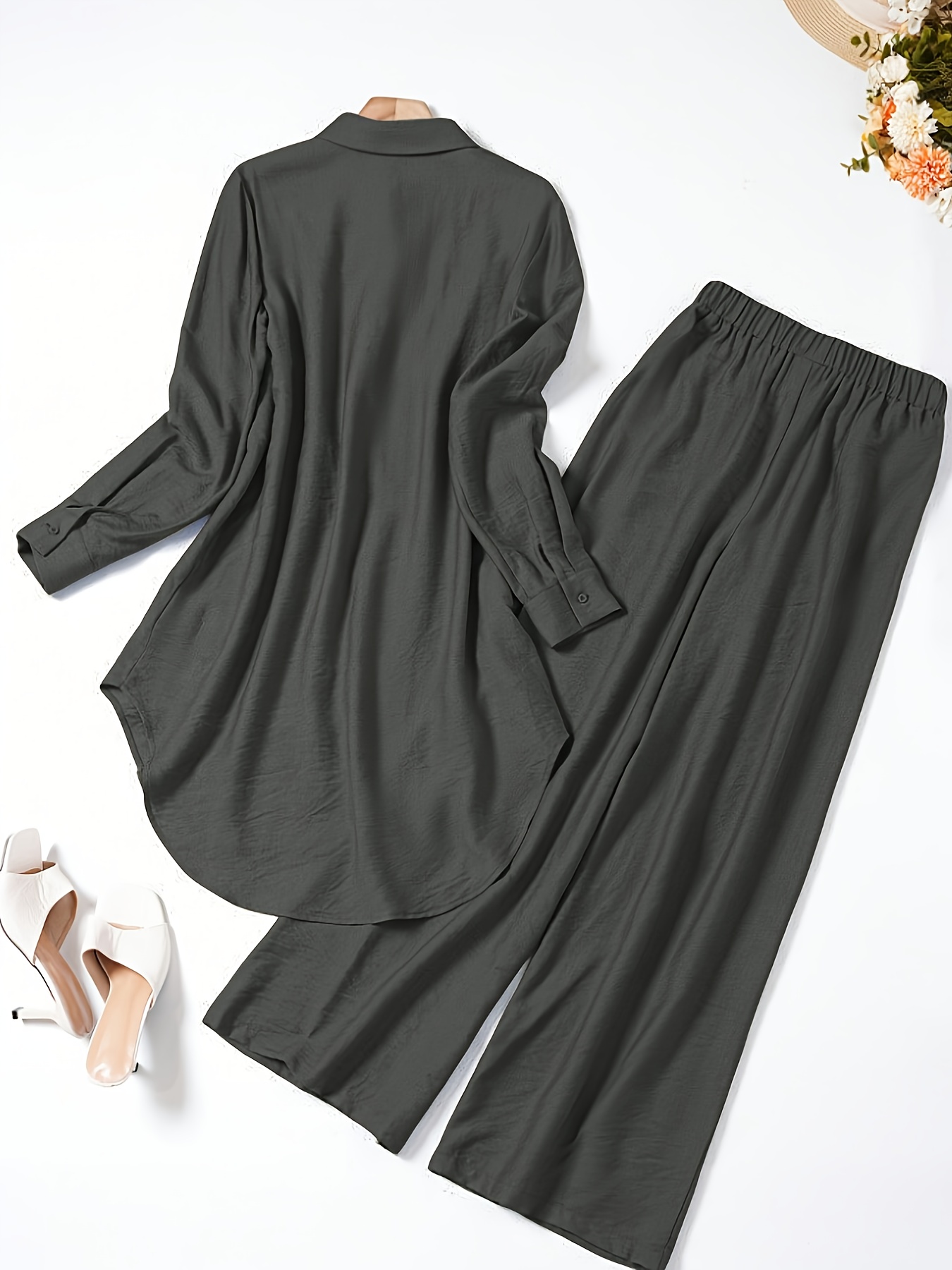 2pcs Women'S Solid Color Long Sleeve Shirt and Pants Set - Elegant Minimalist Casual Attire, Button-Up Blouse with Ruffled Sleeves and Wide-Leg Pants, All-Season Versatile Outfit, Casual Attire|Ruffled Sleeve Top|Buttonup Blo
