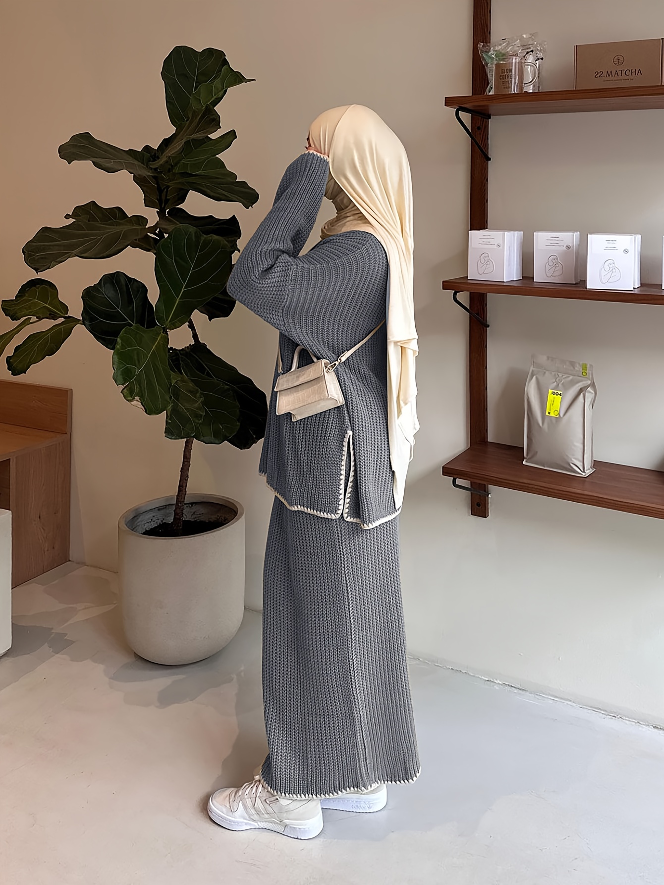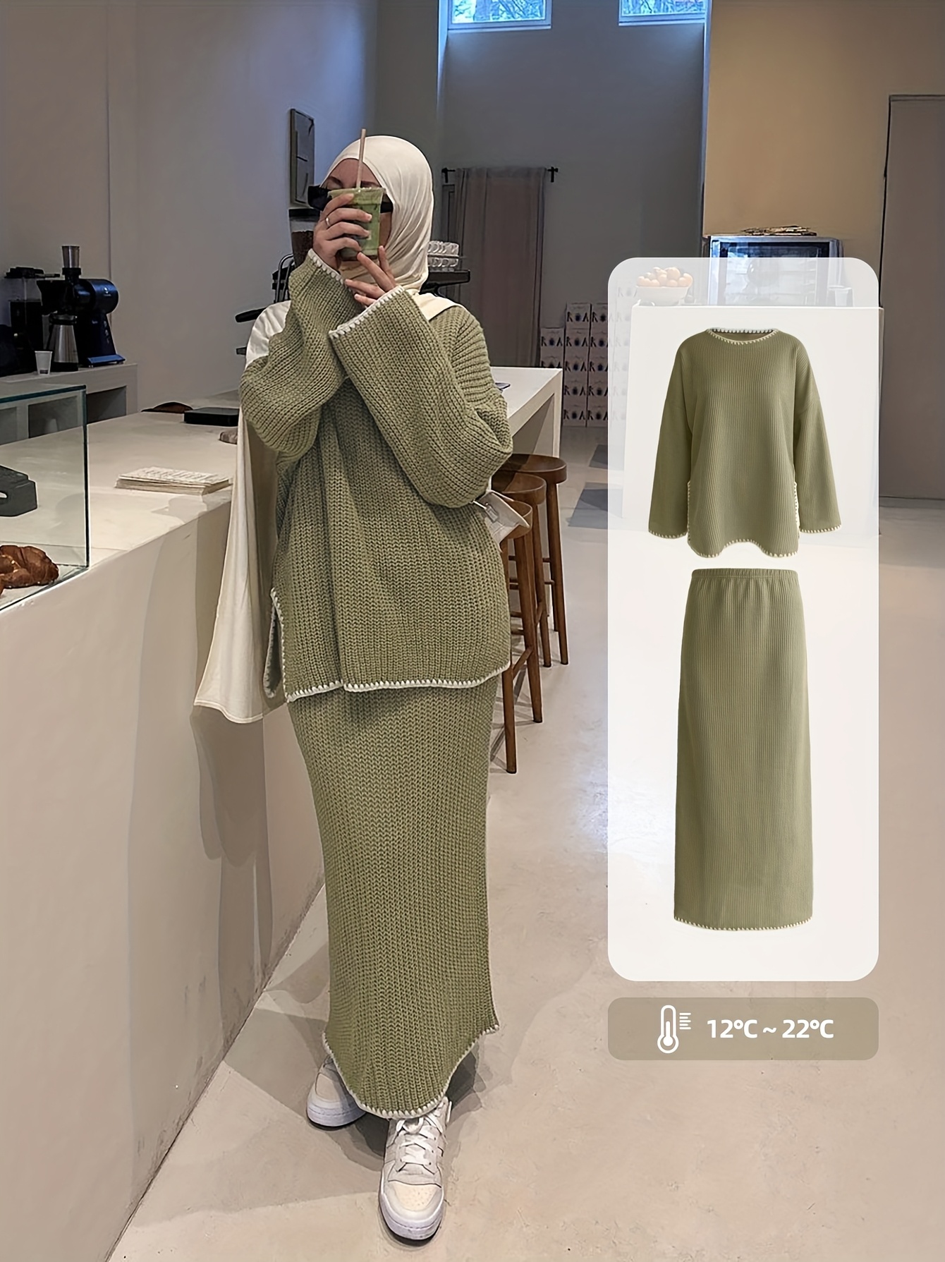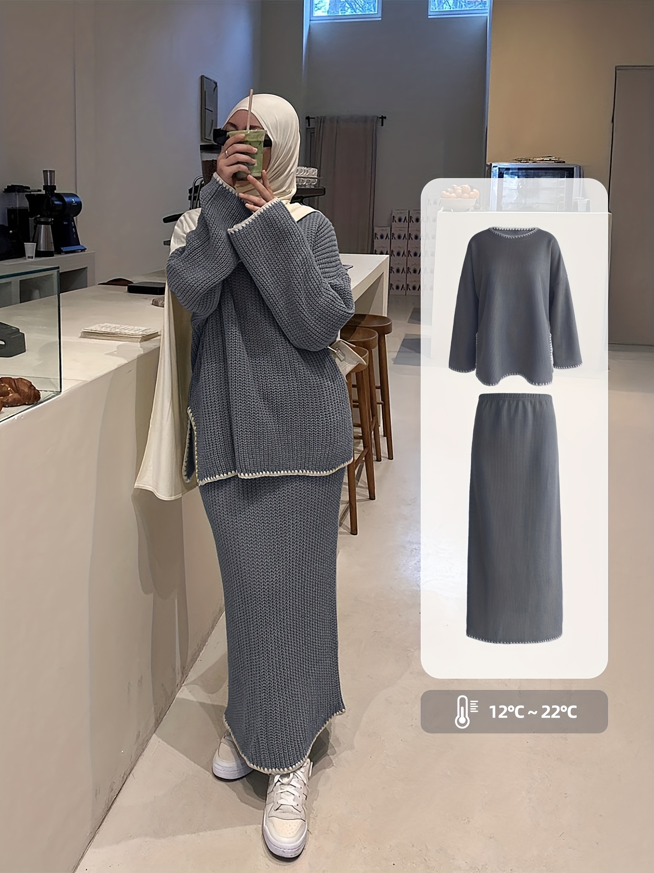 A Two-Piece Solid Color Textured Suit, Consisting of a Loose Top with Shell Embroidery And a Skirt, Suitable for Indoor Casual Coffee Occasions, Suitable for Autumn And Winter Wear