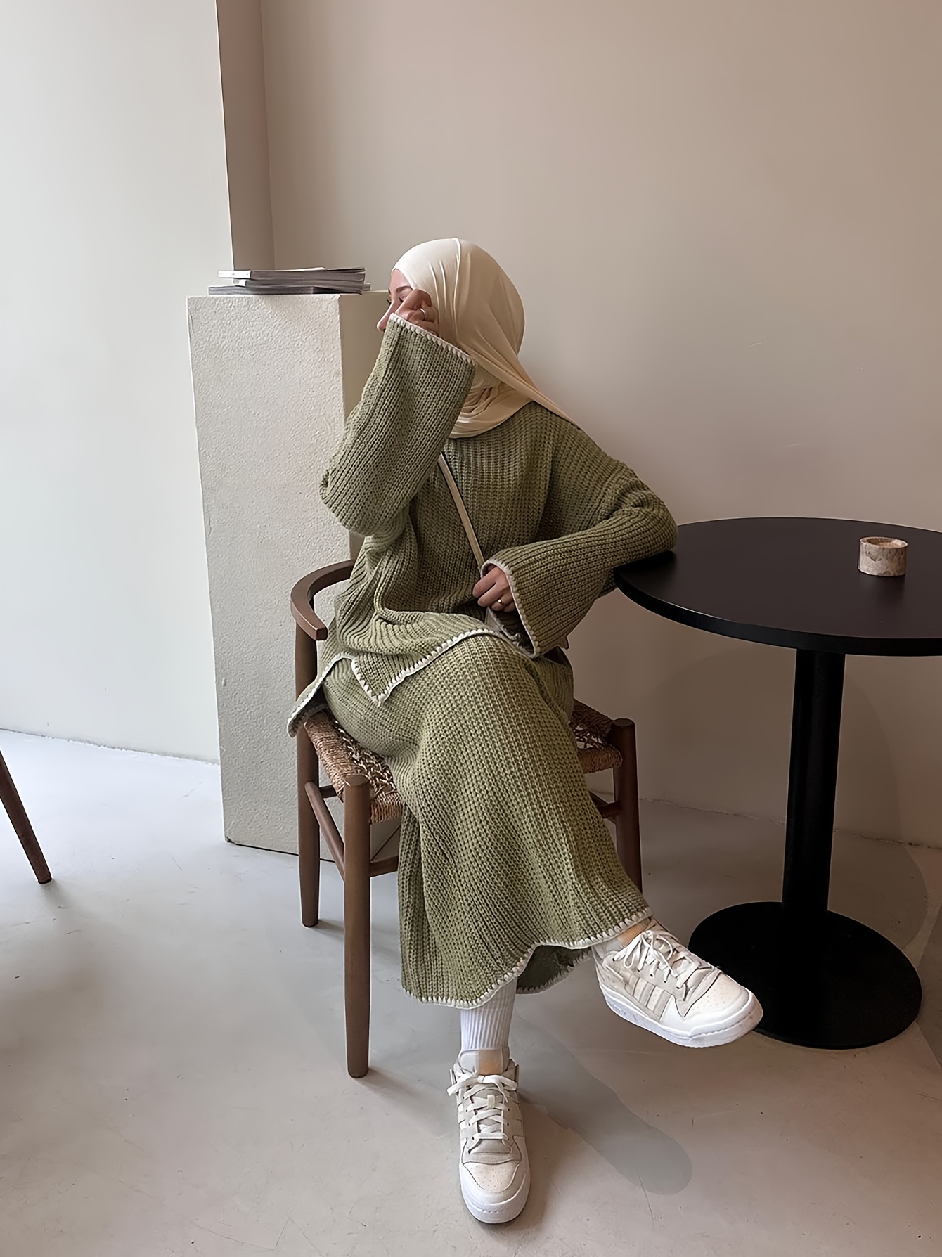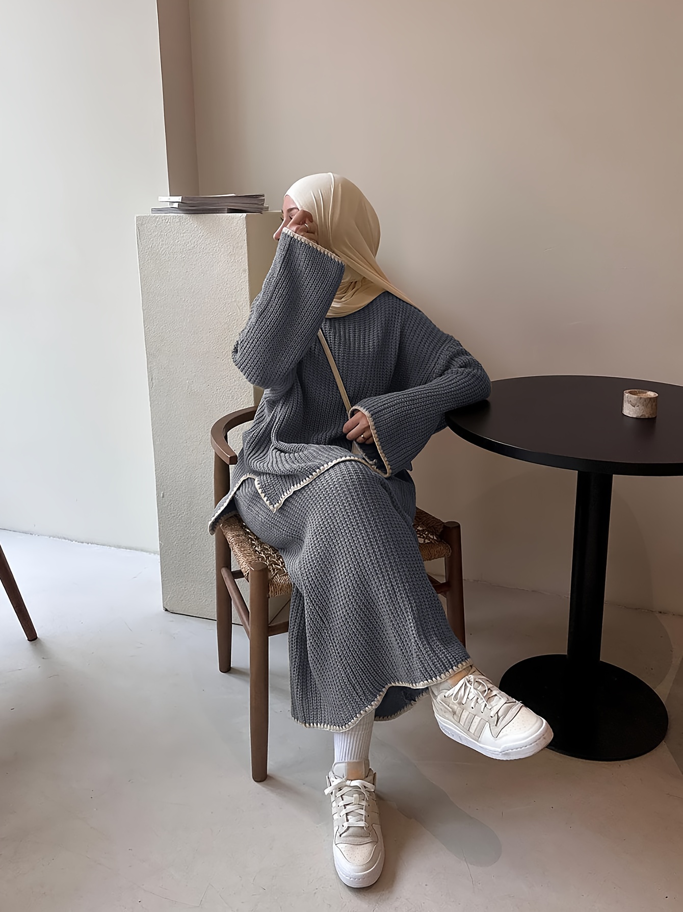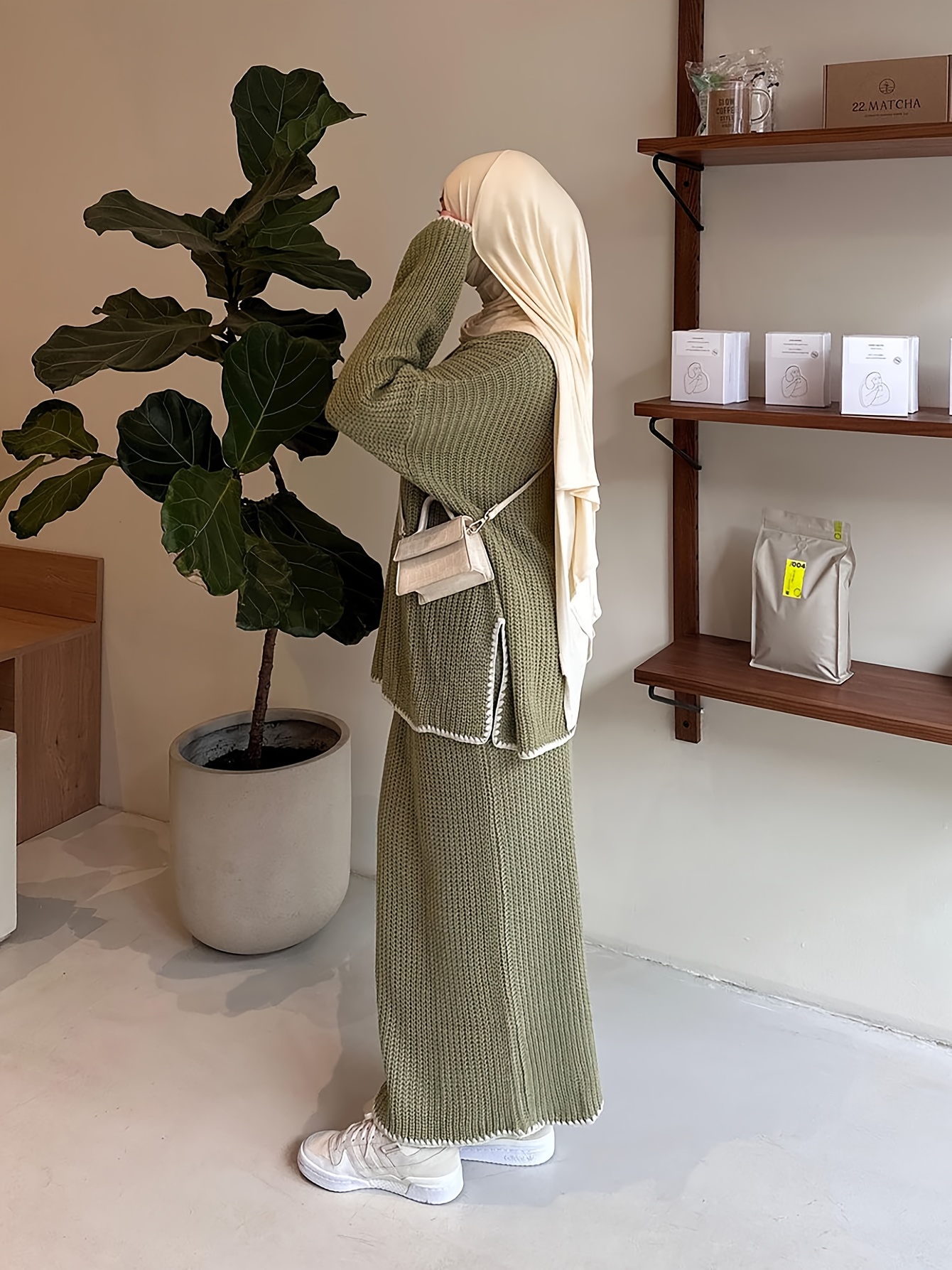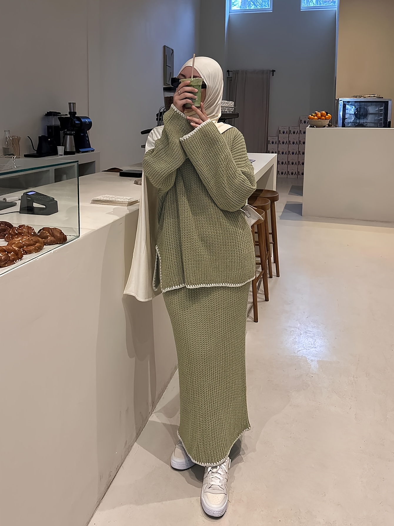 A Two-Piece Solid Color Textured Suit, Consisting of a Loose Top with Shell Embroidery And a Skirt, Suitable for Indoor Casual Coffee Occasions, Suitable for Autumn And Winter Wear