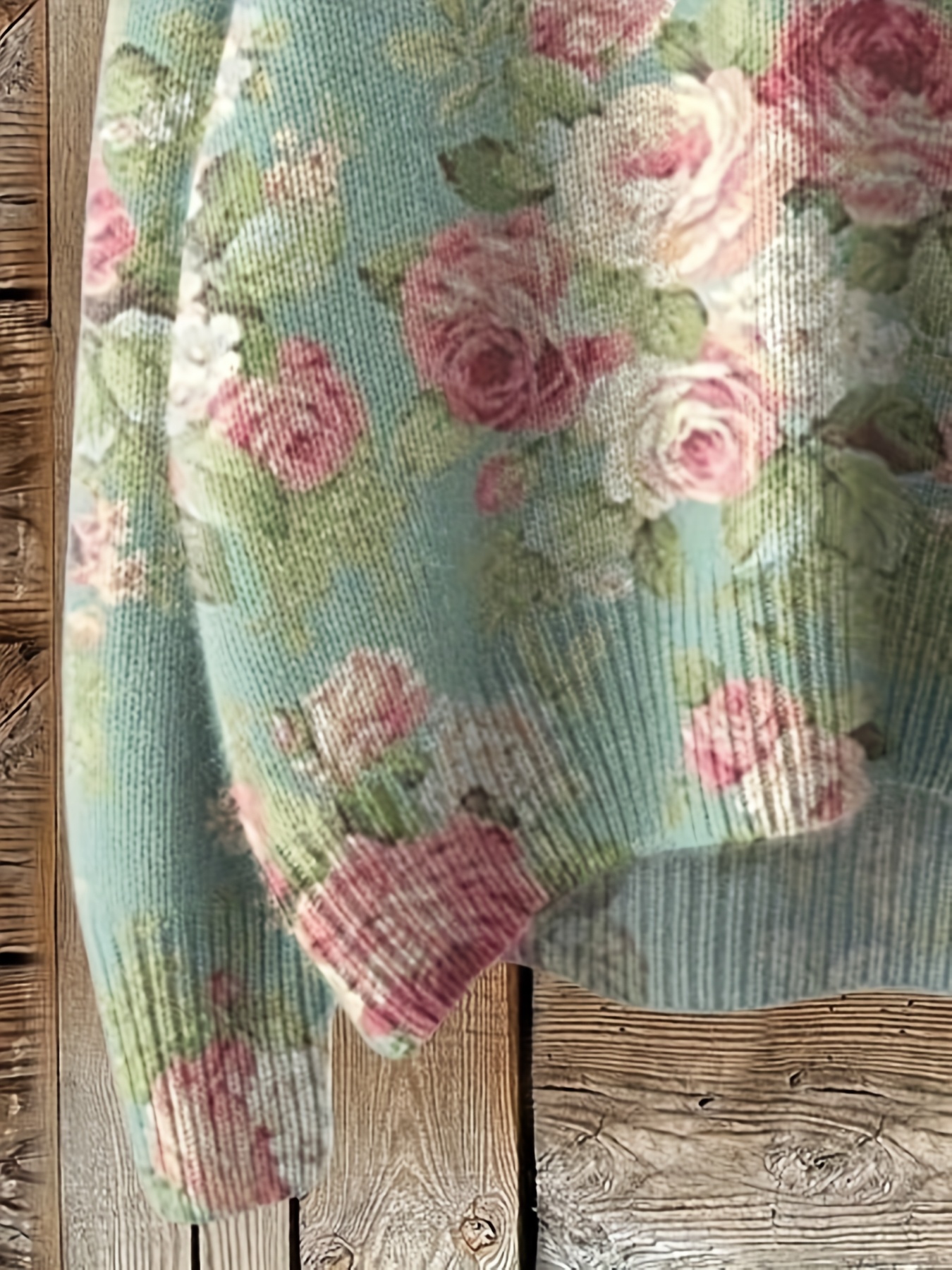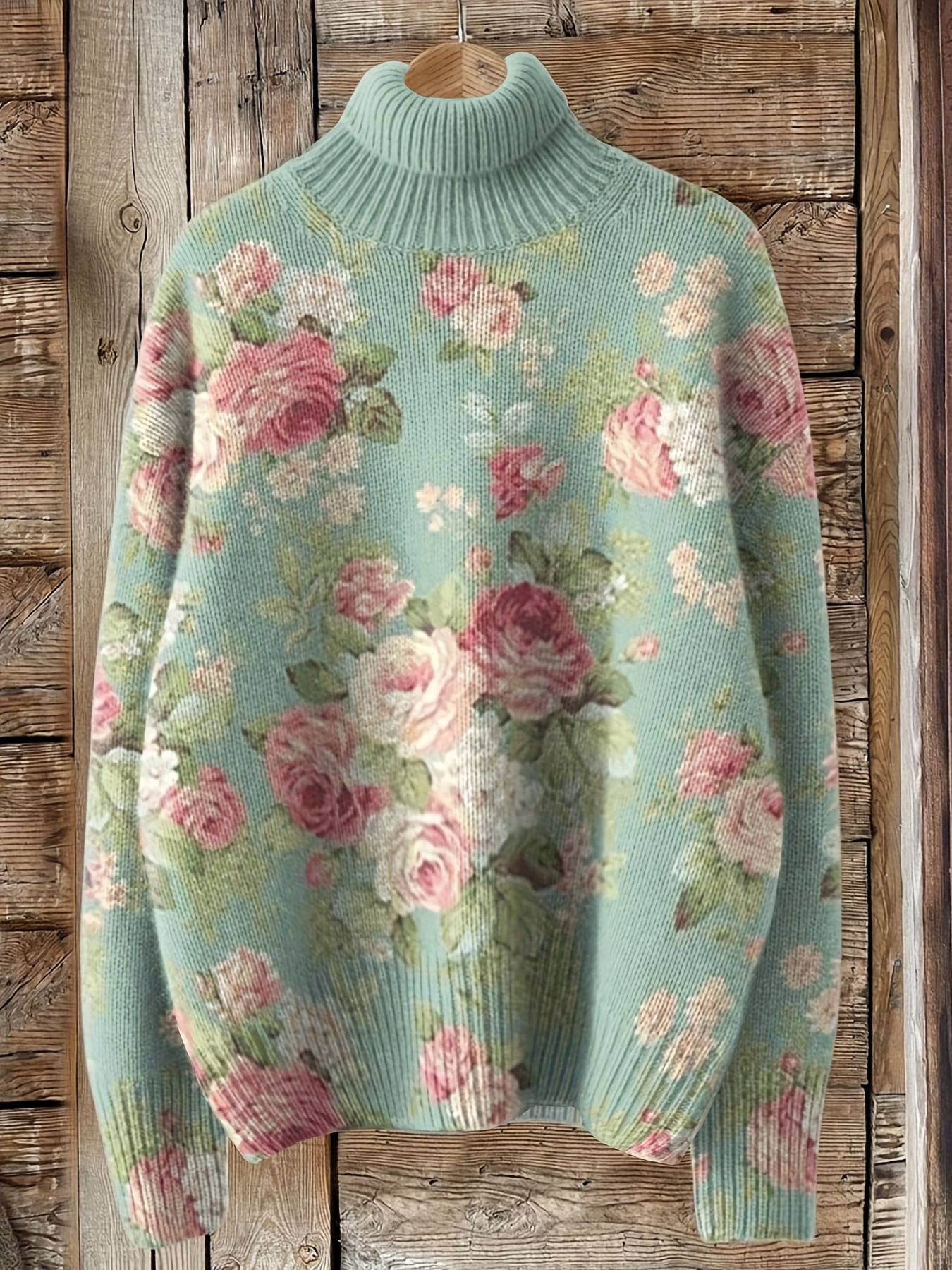 Women's Floral Print Sweater Mint Green with Pink Roses & Foliage - Soft High Neck Long Sleeve Cozy Fall Winter Sweater for Casual & Semi-Formal Outfits, Versatile Layering Piece, Sweater for Women, Sweater, Knitwear Women Wi