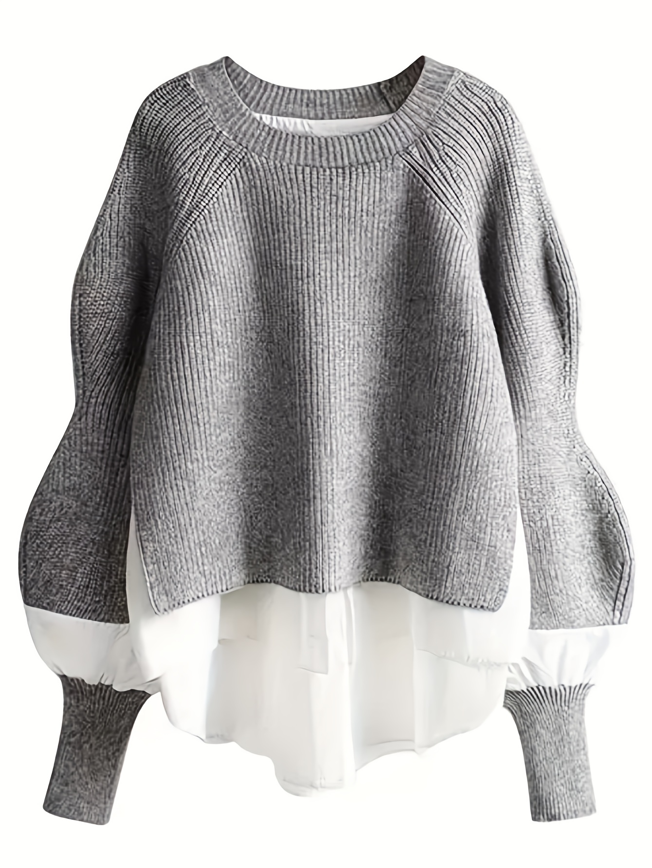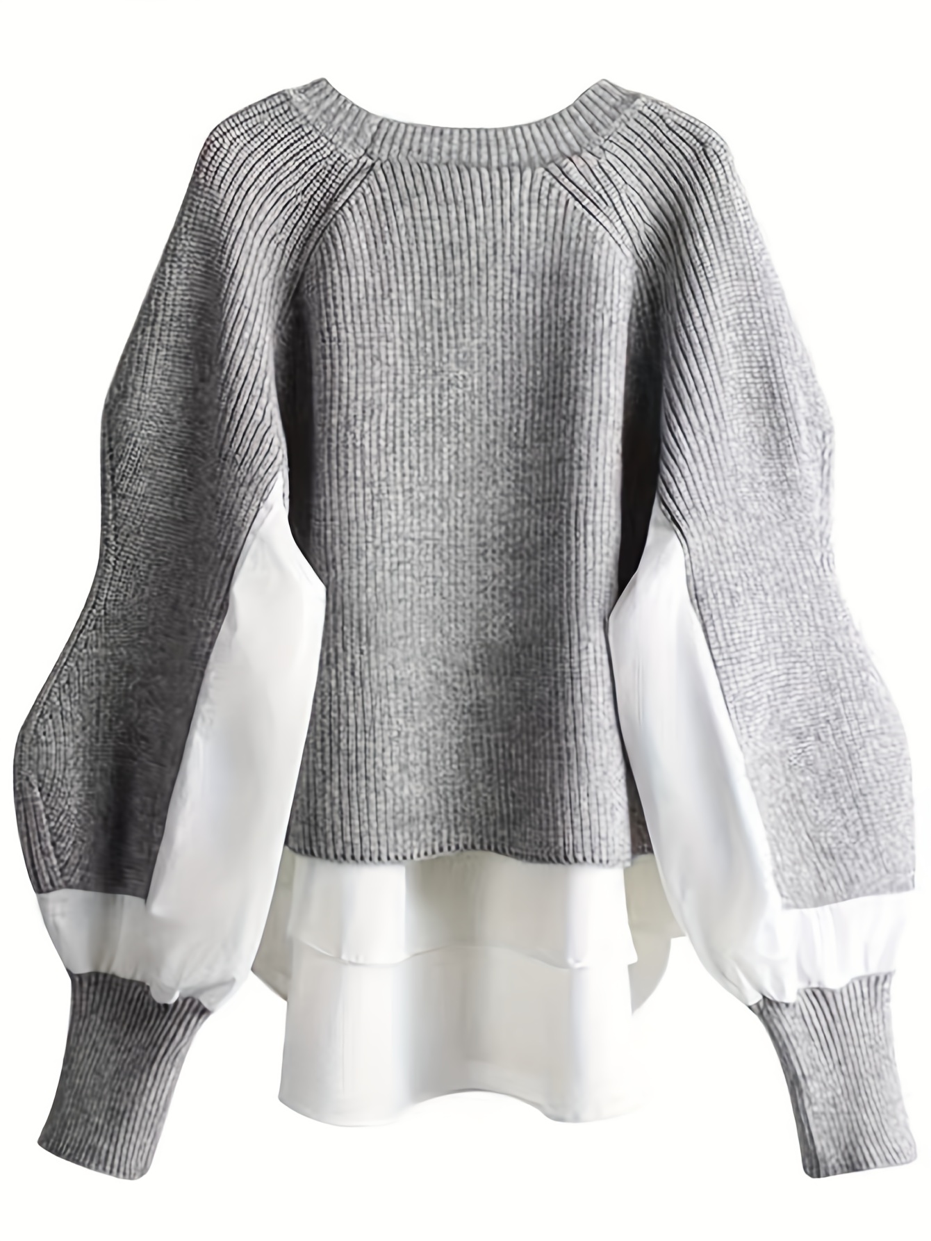 Women's Sweater - Elegant Mock Two-Piece Layered Look, Black Sweater for Spring/Fall Transitional Weather, Chic Office & Party Sweater, Sweater, Textured Knitwear